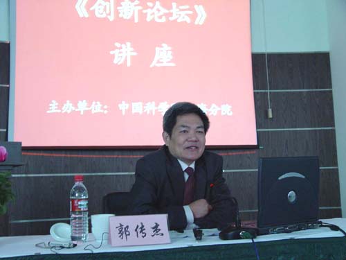 郭传杰书记在上海分院举办的领导干部创新论坛上做报告。 为提高领导干部的宏观思维、创新管理和组织领导科技创新的能力,确保研究所贯彻中科院新时期发展战略,实现创新跨越、持续发展,中科院上海分院于4月6日上午,举办了领导干部创新论坛。第一讲,由中国科学院党组副书记兼中国科技大学党委书记郭传杰作题为“新时期科技管理:使命、特征及职业素质”的报告。中科院沪区各研究院所领导班子成员(含所长助理)、上海分院领导班子成员及机关正、副处长等100余人参加了论坛。