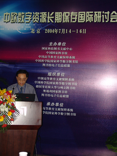 2004年7月14至16日,“中欧数字资源长期保存国际研讨会”在北京中国科学院文献情报中心成功召开。 2004年7月14至16日,“中欧数字资源长期保存国际研讨会”在北京中国科学院文献情报中心成功召开。此次会议是在中科院国家科学数字图书馆(CSDL)和国际图书馆电子信息联盟的积极倡导下,由中国国家科技图书文献中心、中国国家图书馆、中国高等教育文献保障系统、中国科学院国家科学数字图书馆、德国哥廷根大学图书馆、奥地利国家图书馆共同组织,并由中国高等教育文献保障系统、中国科学院国家数字图书馆项目管理中心联合承办。