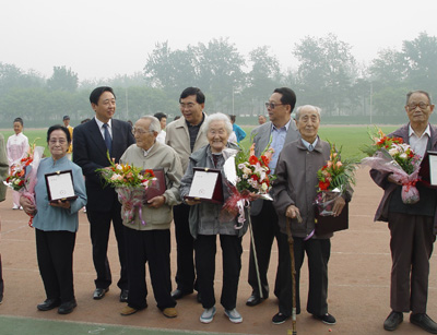 随后领导和来宾向获得京区健康老人称号的14位85岁以上老同志颁发了“健康老人”奖牌和鲜花。中科院京区14个单位的304名老同志分别进行了8个项目的丰富多彩的老年健身操和老年健身舞的表演。