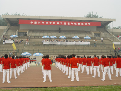 来自京区41个单位1679名运动员、教练员、裁判员参加了京区第三届老年健身运动会的各项比赛,白春礼副院长亲自为运动会提写了:“迎奥运全民健身、常锻炼益寿延年”的贺词。他祝愿老同志们获得竞赛成绩和精神文明双丰收,祝贺大会圆满成功。