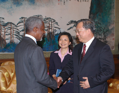 10月10日晚,应中国政府邀请来华访问的联合国秘书长科菲·安南在他下榻的钓鱼台国宾馆会见了全国人大常委会副委员长、中科院院长路甬祥。在会谈中,安南对中科院在促进科学在中国的发展,以及促进国际科技合作方面所做的工作留下了很深印象。他说,中国的发展生机勃勃,所取得的成就和获取的经验对发展中国家,特别是非洲国家非常有借鉴作用。(摄影/郭拓飞) 10月10日晚,应中国政府邀请来华访问的联合国秘书长科菲·安南在他下榻的钓鱼台国宾馆会见了全国人大常委会副委员长、中科院院长路甬祥。在会谈中,安南对中科院在促进科学在中国的发展,以及促进国际科技合作方面所做的工作留下了很深印象。他说,中国的发展生机勃勃,所取得的成就和获取的经验对发展中国家,特别是非洲国家非常有借鉴作用。