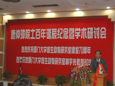 纪念唐仲璋院士百年诞辰暨学术研讨会在厦门举行。 12月10日上午,中国科学院已故院士、我国著名的生物学家唐仲璋院士的百年诞辰纪念会在厦门大学隆重举行。厦门大学党委副书记潘世墨、厦门大学副校长孙世刚、中国科学院生命科学和医学学部副主任强伯勤院士,以及来自国内外有关单位的领导和专家、教授近200人参加了纪念会。纪念大会由厦门大学生命科学学院党委书记司卓亚主持,厦门大学副校长孙世刚、厦门大学生命科学学院院长林圣彩、有关到会来宾、唐仲璋院士不同时期培养的学生代表纷纷发言,从不同的角度满怀深情地回忆唐仲璋先生孜孜不倦对科学执著的追求和教书育人所做出的重大贡献。唐仲璋先生的女儿——中科院生命科学和医学学部院士唐崇惕先生在纪念会上致答谢词。福建省委组织部、福建省科协、中国农业科学院兰州兽医科研站等单位发去了贺信,强伯勤院士代表中国科学院学部做了热情洋溢的讲话。
