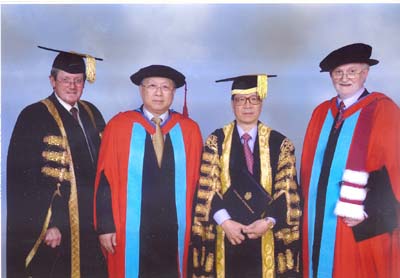 2004年12月10日,英国诺丁汉大学以隆重、庄严的方式向中国科学院路甬祥院长授予该校荣誉理学博士学位,以表彰他在科学和工程方面所取得成绩以及对中国科技发展所作出的卓越贡献。图为路院长在接受荣誉学位后分别与诺丁汉大学校长Colin Campbell爵士、校监杨福家教授以及校长助理Don Grierson教授的合影。