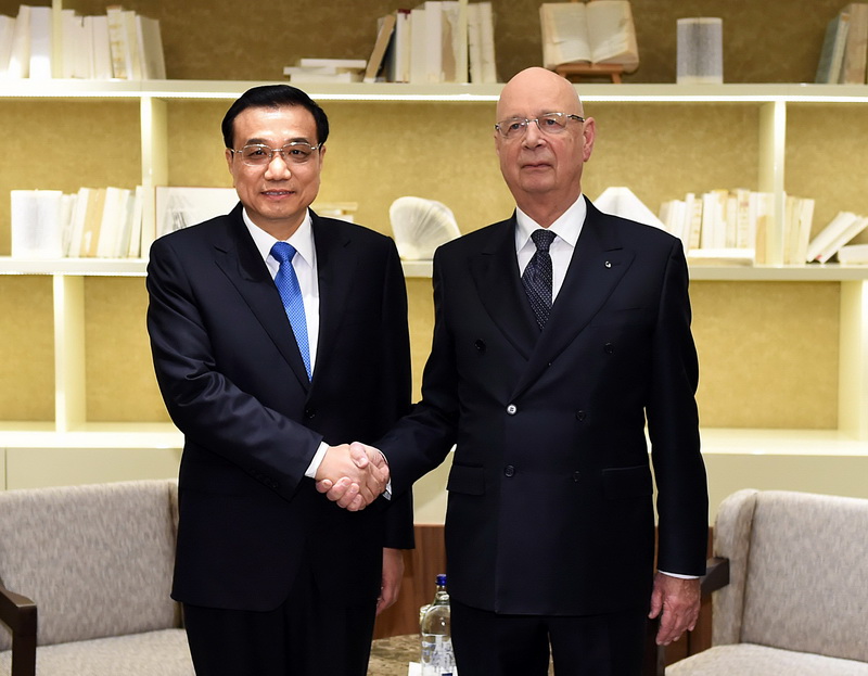 1月20日,中国国务院总理李克强在瑞士达沃斯会见世界经济论坛主席施瓦布。新华社记者 李涛 摄