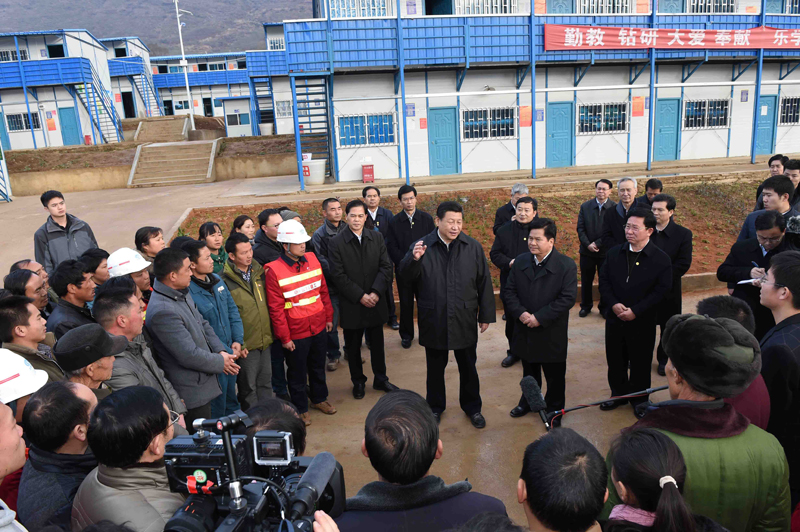 1月19日至21日,中共中央总书记、国家主席、中央军委主席习近平来到云南昭通、大理、昆明等地,看望鲁甸地震灾区干部群众,深入企业、工地、乡村考察,就灾后恢复重建和经济社会发展情况进行调研。这是1月19日,习近平来到鲁甸县小寨镇甘家寨红旗社区过渡安置点,看望受灾群众。新华社记者 鞠鹏 摄
