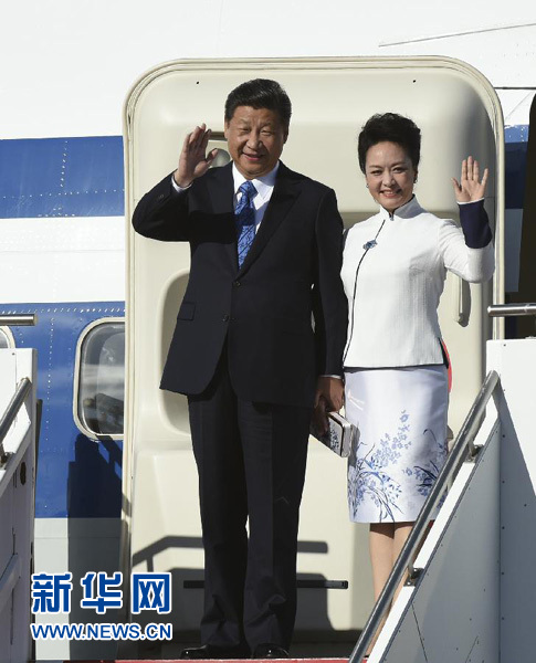 9月22日,国家主席习近平抵达美国华盛顿州最大城市西雅图,开始对美国进行国事访问。这是习近平和夫人彭丽媛步出舱门。新华社记者黄敬文摄