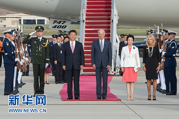 下午5时40分许,习近平乘坐的专机抵达华盛顿安德鲁斯空军基地。美国副总统拜登和夫人专程来到机场,热情欢迎习近平和夫人彭丽媛。美国儿童向习近平夫妇献花。礼兵分列红地毯两侧。军乐队奏响中美两国国歌。