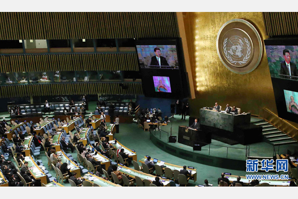 9月26日,国家主席习近平在纽约联合国总部出席联合国发展峰会并发表题为《谋共同永续发展 做合作共赢伙伴》的重要讲话。新华社记者马占成摄