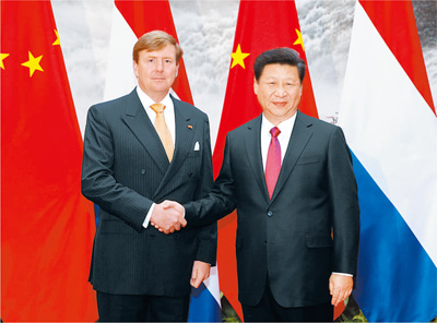 威廉—亚历山大国王表示,荷兰与中国保持着传统友好关系。中国是荷兰第二次世界大战时期在亚洲的重要盟友。两国虽然国情不同,但新形势下可以在农业、畜牧业、水利、金融、法治等广泛领域开展互利合作,在联合国维和行动、可持续发展、应对气候变化等重大国际问题上密切交流协调。中方发起的“一带一路”和亚洲基础设施投资银行倡议具有重要意义,荷方愿积极参与相关合作,并支持“一带一路”规划与欧洲投资计划对接合作。荷方赞同加强教育、体育等领域两国人文交流,感谢中方同意与荷兰合作开展大熊猫保护研究。荷方支持加强欧盟同中国关系,将在轮任欧盟主席期间积极推动自由贸易和人员往来。