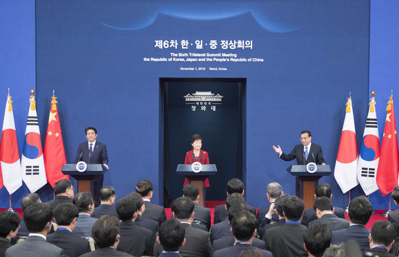 当地时间11月1日下午,国务院总理李克强在第六次中日韩领导人会议后,与韩国总统朴槿惠、日本首相安倍晋三共同会见记者。新华社记者 王晔 摄