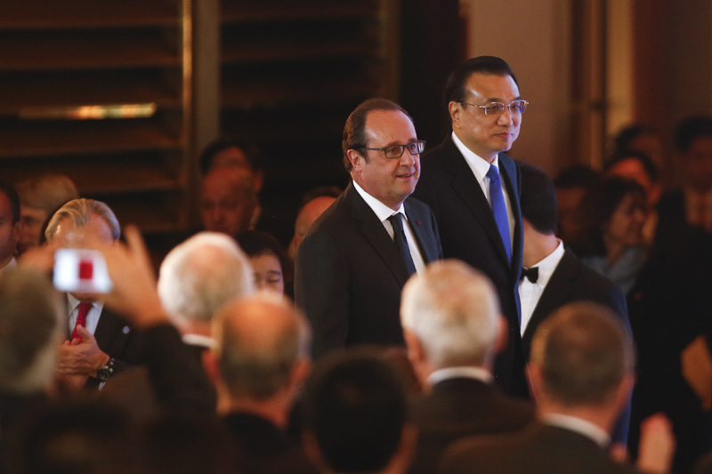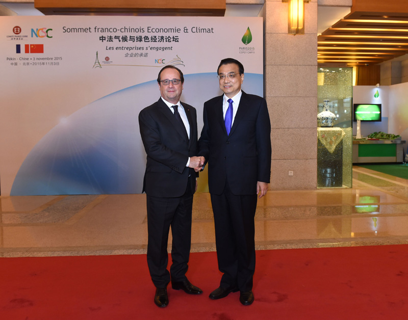 国务院总理李克强11月3日上午在钓鱼台芳菲苑与法国总统奥朗德共同出席中法气候与绿色经济论坛闭幕式。