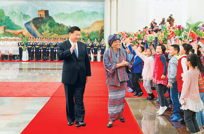 11月3日,国家主席习近平在北京人民大会堂同利比里亚总统瑟利夫举行会谈。这是会谈前,习近平在人民大会堂北大厅为瑟利夫举行欢迎仪式。新华社记者 黄敬文摄