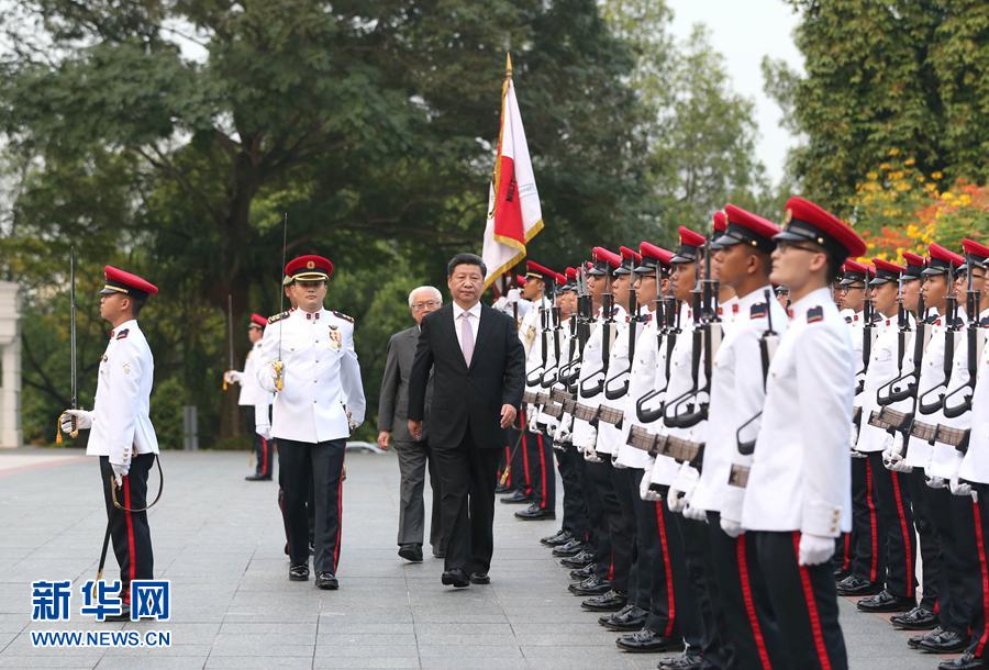 11月6日下午,国家主席习近平在新加坡总统府会见新加坡总统陈庆炎。会见前,陈庆炎在总统府广场举行隆重欢迎仪式。这是习近平在陈庆炎陪同下检阅仪仗队。新华社记者 马占成 摄