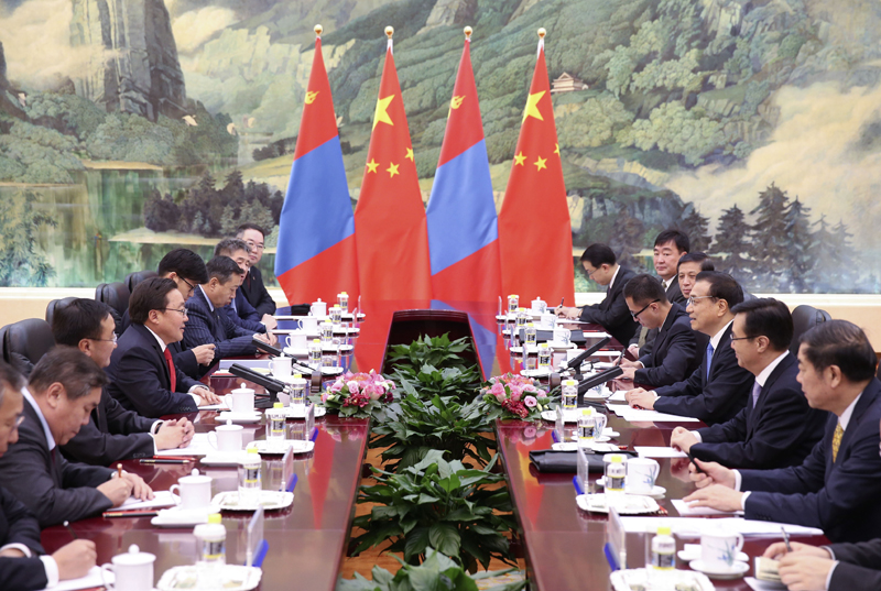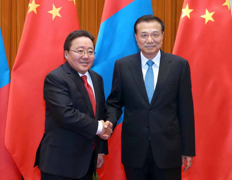 李克强表示,中国政府高度重视发展同蒙古国的关系。昨天,习近平主席同你举行了富有成果的会谈。中方尊重蒙古国的主权、独立和领土完整,尊重蒙古国人民自主选择的发展道路,愿同蒙方继续保持高层交往,加强各领域交流合作,密切在国际和地区事务中的协调配合。贵国明年将举办亚欧首脑会议。中方愿同蒙方协调配合,推动会议在巩固和平稳定、加强团结互信、促进增长繁荣方面取得丰硕成果。