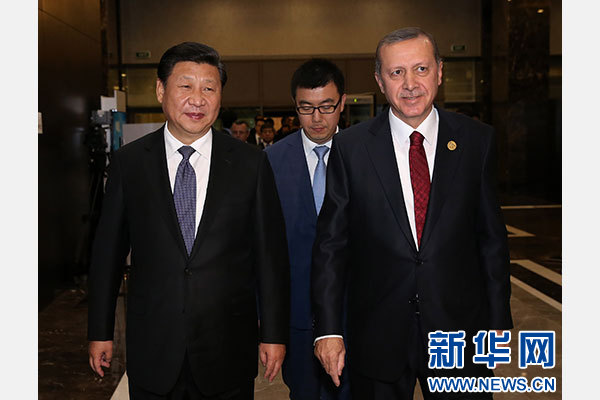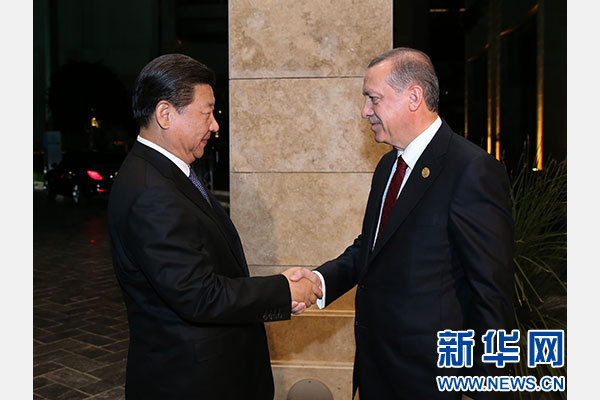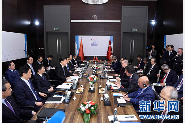 埃尔多安表示,欢迎习近平主席来土耳其出席二十国集团峰会。土中两国保持密切高层和各领域交往,有助于增进相互理解、促成共识,对推动两国关系深入发展十分重要。土方高度重视对华关系,愿在相互尊重基础上,继续同中方深化政治、经济、能源、文化、安全、旅游等各领域合作,并同中方一道努力,提高两国贸易水平。土方愿积极参加“一带一路”框架下合作,欢迎中国企业加大对土耳其基础设施等领域投资。土方决不允许任何势力在土从事反华和破坏土中关系的活动。