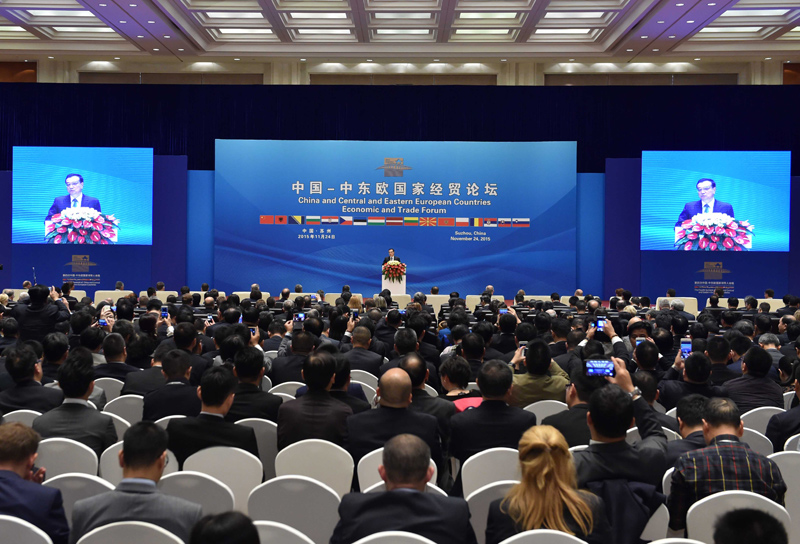 11月24日,国务院总理李克强在苏州太湖国际会议中心与中东欧16国领导人共同出席中国-中东欧国家第五届经贸论坛开幕式并致辞。新华社记者 高洁 摄