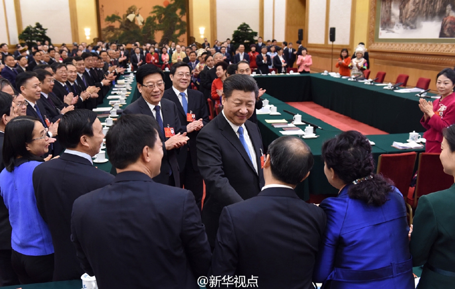 8日上午,习近平参加湖南代表团审议。正值三八国际劳动妇女节,总书记代表党中央、国务院,向女代表、女委员、女工作人员和全国各族各界妇女致以节日的祝贺和诚挚的祝福。会议结束时,习近平同代表们握手道别。女代表纷纷围拢过来,向总书记表示感谢。习近平再次向妇女同胞表示祝贺。(新华社记者霍小光,摄影兰红光、饶爱民,新华视点微博报道)
