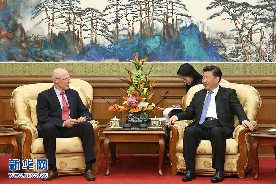 4月19日,国家主席习近平在北京钓鱼台国宾馆会见美国前财长保尔森。新华社记者庞兴雷 摄