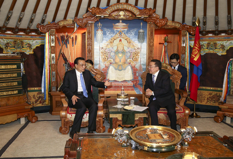 国务院总理李克强当地时间7月14日上午在乌兰巴托国家宫会见蒙古国总统额勒贝格道尔吉。