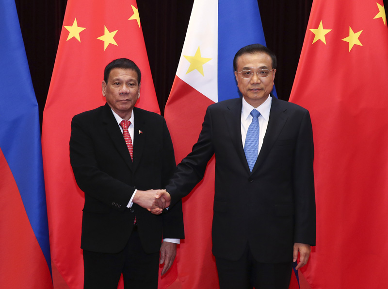 李克强表示,中菲是一衣带水的邻邦,有着长期友好交往的历史。今天上午,习近平主席同你举行了富有成果的会谈,对今后一个时期两国关系与合作进行了全面规划。中方重视发展同菲律宾的关系,愿同菲方共同努力,相向而行,加强各领域交往与合作,推动中菲关系回到正常发展轨道,切实造福两国人民。