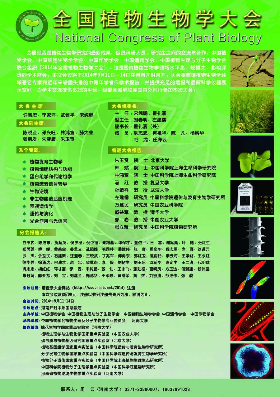 为展现我国植物生物学研究的最新成果,促进科研人员、研究生之间的交流与合作,中国植物学会、中国细胞生物学学会、中国作物学会、中国遗传学会、中国植物生理与分子生物学会联合组织“2014年全国植物生物学大会”。这是国内植物生物学领域水平高、规模大、影响深远的学术盛会。本次会议将于2014年9月11日至14日在河南开封召开。大会将邀请植物生物学领域著名专家和近年来崭露头角的中青年学者作学术报告、并提供充足的墙报和最新科学仪器展示空间,为学术交流提供良好的平台。组委会诚挚欢迎国内外同行参加本次大会。本次会议限额700人,注册以收到注册费先后为序,额满为止。