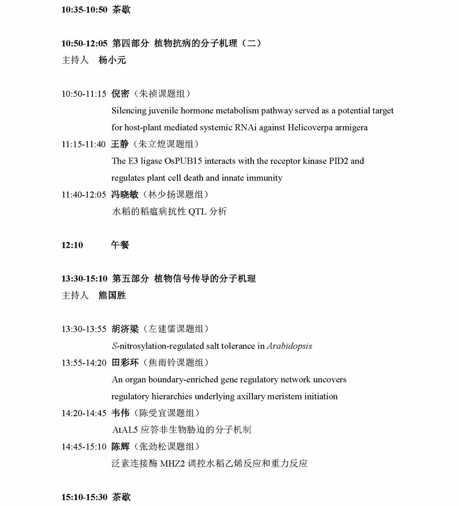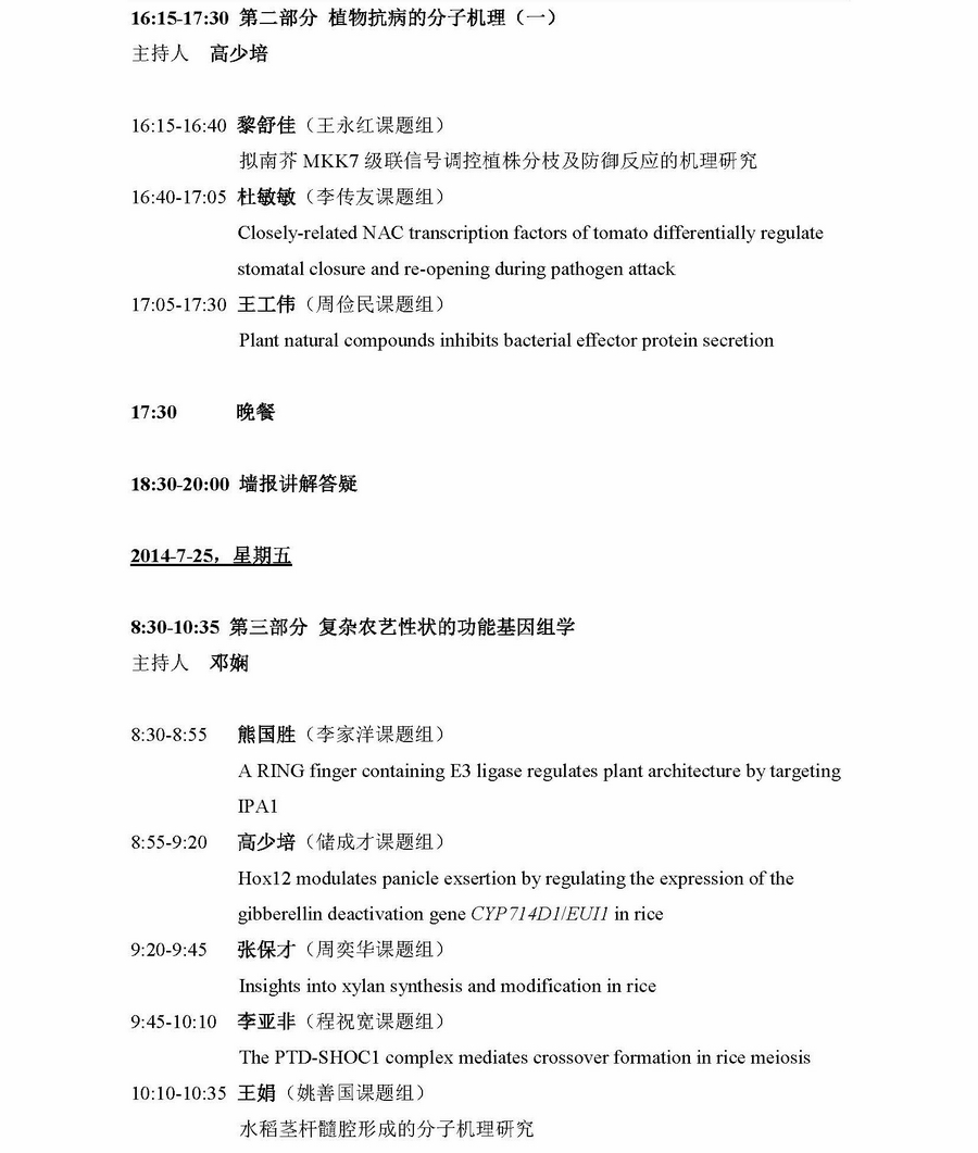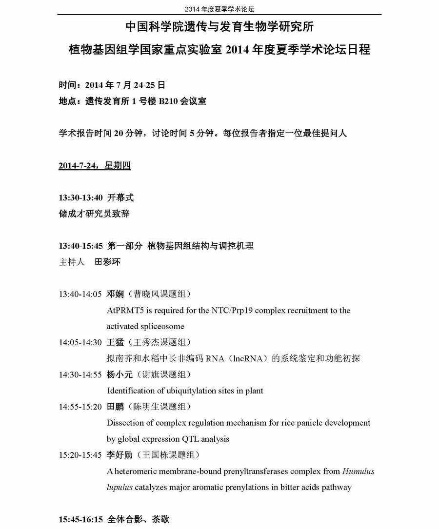 植物基因组学国家重点实验室2014年度夏季学术论坛日程