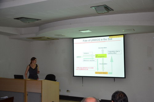 期间,Kuzyakov以Isotope applications for studies of soil C dynamics and sequestration 为题详细讲解了同位素技术在土壤碳循环研究中的应用,并举例分析了利用碳同位素的自然丰度、连续、脉冲标记技术方法在土壤碳循环研究中的应用及其优点和局限,指出了同位素技术是目前为止追踪有机碳来源、土壤微生物对“新碳”、“老碳”利用等方面最有效的手段之一。徐兴良、Anna分别作了题为Nitrogen acquisition strategies by plants 和Microbial utilization of low molecular weight organic substances evaluated by 13C-PLFA in a field experiment 的报告。