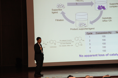 会议特邀了中国科学院院士、英国皇家化学会会士、发展中国家科学院院士、世界创新基金会成员和亚洲化学联合会院士、香港大学支志明教授,中国科学院院士、第三世界科学院院士、欧洲人文和自然科学院院士、中科院大连化物所李灿研究员,国家自然科学基金委员会“杰出青年基金”获得者武汉大学雷爱文教授和中科院上海有机化学研究所刘文研究员分别作了题为Practical Iron Catalysed Organic Oxidative Transformation Reactions 、“多相纳米反应器中的均相催化反应”、Revealing reaction mechanism through active intermediate identification and kinetic investigation 和“以生化反应研究为基础的新生物合成途径及相关天然产物的发现研究”的大会报告。第二届中国均相催化青年奖获得者北京大学药学院焦宁教授、兰州化物所羰基合成与选择氧化国家重点实验室黄汉民研究员分别作了题为Highly Efficient Methodologies via Aerobic Oxygenation 和Exploring New Reactivities for Homogeneous Catalysis: From C-H to C-N Bond Activation 的获奖报告。此外,会议还安排了15个邀请报告、30个口头报告、30个墙报展讲和175个墙报交流。在墙报交流环节,16位研究生获得了“优秀墙报奖”。