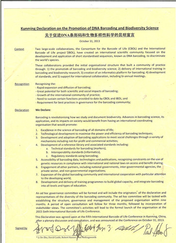 《昆明宣言》强调,生命条形码正在改变我们研究和记录生物多样性的方式。生命条形码学科的发展、应用,及其对社会的影响将得益于一个国际合作组织的建立,以促进:1)各生命门类条形码科学的卓越性;2)技术的发展以最大化地发挥生命条形码技术的力量和有效性;3)生命条形码的应用,通过非盈利性和商业活动等机制更加适应社会需求;4)生命条形码国际参考数据库的建立及其相关标准的发展,包括:生命条形码的技术标准(标准DNA片段)、生命条形码的互通性标准(信息技术)、使用生命条形码的监管标准;5)生命条形码数据、技术和出版物的获取,以认识并遵守国际和各国有关遗传资源获取和惠益分享法律中对其使用的限制因素为前提;6)其它合作伙伴的参与,包括国家政府部门、政府间机构、产业部门、私有机构和非政府组织;7)全球,特别是发展中国家生命条形码研究与国际合作的推广;8)通过培训项目扩大全球生命条形码的能力建设,将生命条形码研究融入到不同层次和类型的教育中去。