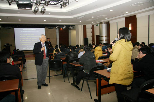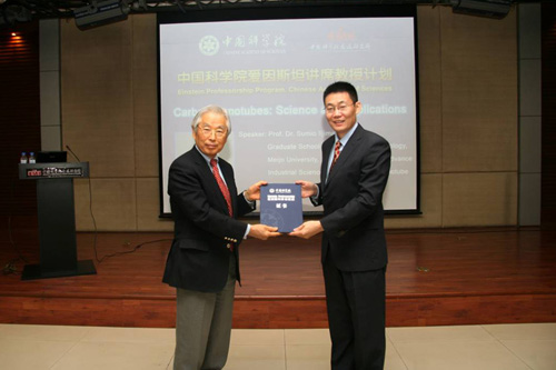 来访期间,饭岛澄男教授为金属所科研人员和研究生作了题目为Carbon Nanotubes: Science and Applications的精彩报告,报告由成会明研究员主持。报告前举行了颁奖仪式,副所长张健代表中国科学院为饭岛澄男教授颁发了“中国科学院爱因斯坦讲席教授”证书。在报告中,饭岛澄男回顾了他同中国科学院特别是金属所的合作历史,一张张珍贵的老照片凝聚了这位著名科学家同中国的深厚友谊。随后饭岛澄男重点讲述了现代电子显微学的重要性及碳纳米管的发现过程,讲述了高质量碳纳米管的制备技术,并阐述了碳纳米管独特的电学性能及其在触屏器件等方面的商业化应用和在光热转换中的一些新进展。最后他还概述了包括高分辨显微学、电子能量损失谱在内的现代电子谱学技术的最新进展及在纳米材料创新研究方面的应用,并展示了对碳纳米管、石墨烯片及其相关纳米材料的原子细节表征的一些典型例子。饭岛澄男鼓励年轻的科研人员要以严谨的科学态度对待科研过程中的每一个细微发现,因为伟大的发现往往就蕴藏其中。饭岛澄男精彩的报告获得了听众的一致好评,会场不时响起掌声和笑声。报告后的提问环节气氛热烈,许多科研人员及研究生就感兴趣的问题同饭岛澄男进行了积极讨论,他幽默机智的解答不时获得阵阵掌声。