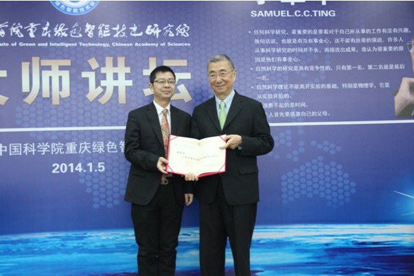 2014年1月5日,应中科院重庆绿色智能技术研究院邀请,诺贝尔物理学奖获得者丁肇中教授在该院综合科研楼一楼学术报告厅用地道的重庆话作了题为“我所经历的实验物理”的学术报告,开启了重庆研究院系列“大师讲坛”序幕。会前,丁肇中教授受聘为重庆研究院“首席科学顾问”。重庆市有关部门负责人,在渝部分高校、科研院所、大型企业等单位的科技主管负责人和科研人员,以及重庆市科委、两江新区管委会和重庆研究院科研人员,共计500余人参加报告会,会议由重庆市人民政府副市长吴刚主持。