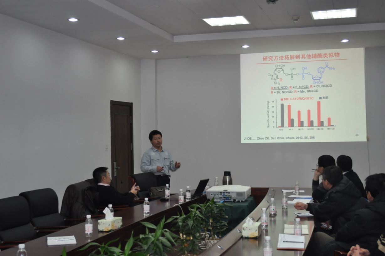 赵宗保介绍了其团队在生物正交NAD依赖性生物催化体系方面取得的研究进展,展示了利用人工合成NAD类似物,以苹果酸酶、乳酸脱氢酶和苹果酸脱氢酶为例成功进行人工氧化还原体系控制代谢途径的研究成果。