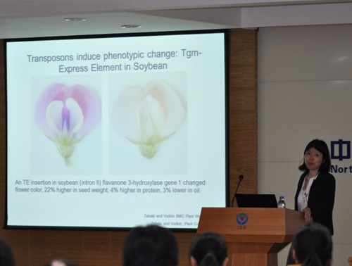蒋宁主要从事植物转座子研究,在揭示转座子在真核基因组进化机制上取得突出成就,其研究团队的成果在Nature,Science,PNAS,Plant cell等杂志上发表。蒋宁以Selective Acquisition of Genomic Sequences by Pack-MULEs and its Impact on Gene Structure in Grasses 为题,深入浅出地讲述了Pack-MULE转座子介导的植物基因组进化研究领域的最新研究进展,并与参加报告会的师生进行了深入的交流。蒋宁在来所期间还访问了哈尔滨园区,对创新国际团队所开展的大豆分子设计育种研究工作提出了多项新的研究思路,为创新团队下一步的研究工作开展提供了很大帮助。