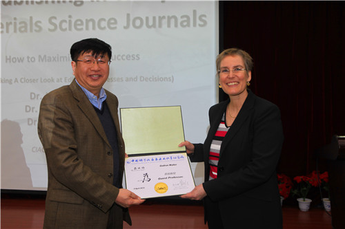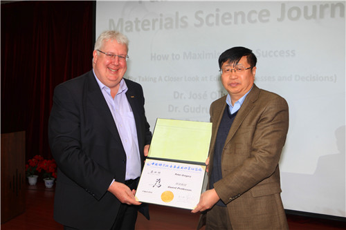 三位外籍教授围绕Publishing in Materials Science—How to maximize your success 的主题,分别做了专题报告。José Oliveira教授从编辑的角度分析了稿件初选、送审、裁定等流程的编辑原则,并针对性地提出了撰写文章的各类注意事项,帮助大家了解了编辑审稿流程,对提高科技论文写作水平有较大帮助。Gudrun Walter教授就Wiley出版社图书出版情况作了概况介绍,向与会者展示了Wiley图书出版的流程。Peter Gregory教授主要介绍了《先进材料》及其姊妹期刊的发展及现状,介绍了世界各地向Advance Materials系列学术期刊投稿及录用情况。Gregory教授特别指出,近年来,来自中国的文章数量逐年攀升,质量日益提高,他充分肯定了我国科研工作者在学术界的贡献和地位。会上,张洪杰还为三位教授颁发了“应用化学系列讲座”纪念铭牌。