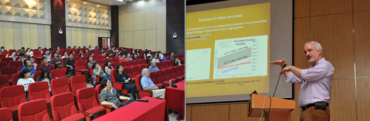 4月4日, Jason Morgan教授首先做了题为Mantle and Core Energetics imply the Existence of Mantle Plumes 的报告,探讨了地核与地幔在冷却速率上存在的差异,从地球动力学的角度为地幔柱的形成机制提供了有利支持。接着Morgan教授又做了题为Serpentine, Slab Bending, and Subduction 的报告,连续的两个精彩报告激发在场师生开展了热烈的讨论。报告会由科技处处长袁超主持,同位素地球化学国家重点实验室以及其他实验室的100余名师生参加了报告会。