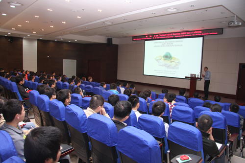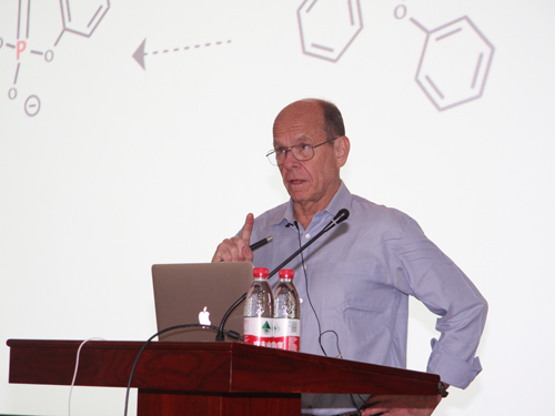 访问期间,Sharpless和Wu Peng为上海有机所的师生做了精彩的学术报告,报告会由副所长俞飚主持。Sharpless围绕点击化学(Click Chemistry)、金属Cu催化叠氮和炔基化合物的环加成反应(Cu-Catalyzed Azide-Alkyne Cycloaddition ,简称CuAAC反应)前沿进展做了题为A New “Perfect” Click Reaction “CuAAC has a sibling”的学术报告;Wu Peng做了题为Imaging Glycans in Living Organisms 的学术报告,详细介绍了成像聚糖在细胞环境下如何使用生物正交点击化学领域的化学手段。上海有机所200多名科研人员和研究生参加了报告会,与两位教授进行了积极的互动并深入探讨了有关报告内容。