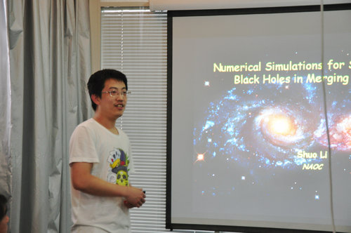 李硕专业从事星系核心黑洞数值模拟,在本次午间学术沙龙中介绍了在他和合作者最近研究工作中的新发现“星系中心的双黑洞系统”。他们利用数值模拟分析了实际观测到的星系核,发现其中可能寄宿着非常靠近的双黑洞。这一发现被风趣地比喻为宇宙中的“双黄蛋”。