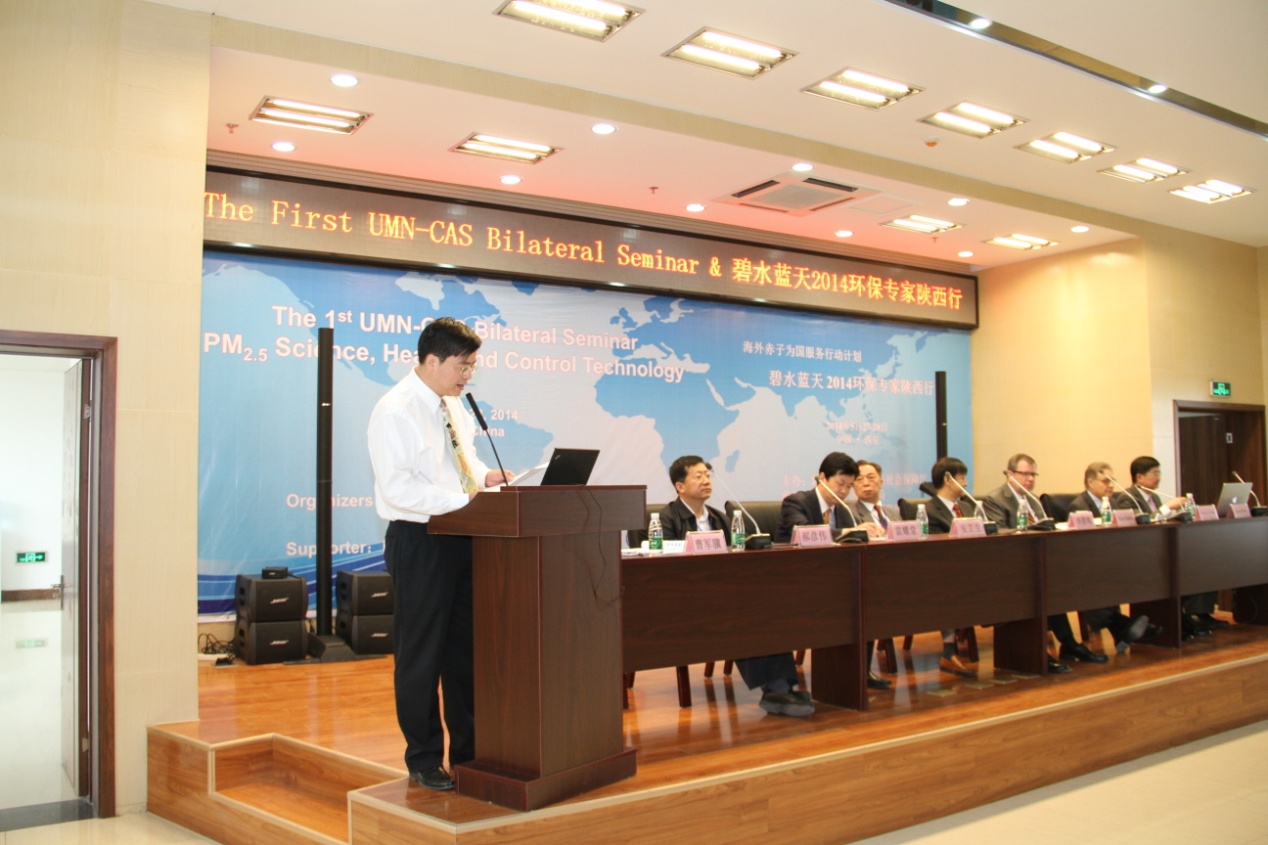第一届双边论坛主题是PM2.5 Science, Health Effects, and Control Technology。双方针对颗粒物监测与控制技术、输送与转化机制、颗粒物健康效应及源解析等热点和关键问题进行交流,探索和开发适合中国的颗粒物标准及污染控制技术。明尼苏达大学校长Eric Kaler院士,科学与工程学院院长Steven Crouch院士和国际著名颗粒物技术专家David Pui带领约50人的美方代表团参加此次论坛,其中包括明尼苏达大学机械、工程、卫生、护理等学院约10余名教授,以及3M公司、巴斯夫(BASF)公司、Donaldson公司、波音公司和TSI公司等国际大型企业代表。中国科学院副院长李静海院士,中国科学院内14个研究所的20余名专家,以及清华大学、北京大学、西安交通大学、南开大学等高校学者出席论坛并作报告。陕西省环保厅和陕西省环科院派出20余名环境保护一线工作者参加论坛并参与讨论。中科院地环所安芷生院士,中科院安光所长刘文清院士,西安交通大学陶文铨院士等出席了会议。