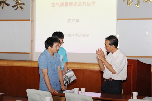 苏中波对陆表水文过程研究工作做了前沿性报告,并展示了利用重力卫星观测三峡的研究工作。金继明深入分析了北美季风的成因,并用区域气候模式进行了模拟。盛立芳通过观测实验,就南海飞沫气溶胶的成因、发展等方面进行了详细介绍,并深入探索模式模拟中源函数的配置问题。安兴琴则为与会人员普及了细微颗粒物对人体的危害;同时,对空气质量模式进行了详细讲解。