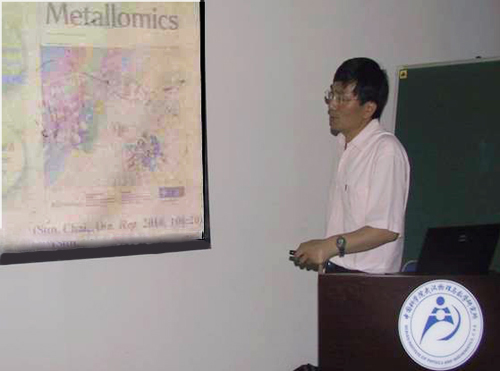 在学术报告中,孙红哲教授指出蛋白质分子中有很多蛋白质分子需要结合金属离子,被称作为“金属蛋白”。金属蛋白中的金属离子对蛋白质的结构与功能起着至关重要的作用,许多蛋白质的重要生物功能都需要金属离子的参与。然而,对于金属离子在体内的转运机制至今还没有一个明确的解释。孙红哲教授介绍了他们研究组最近的研究工作,利用核磁共振波谱和质谱技术深入阐明了体内铜转运介导的细胞如何摄取铜和顺铂的机制,这对新型抗癌药的开发具有重要意义。