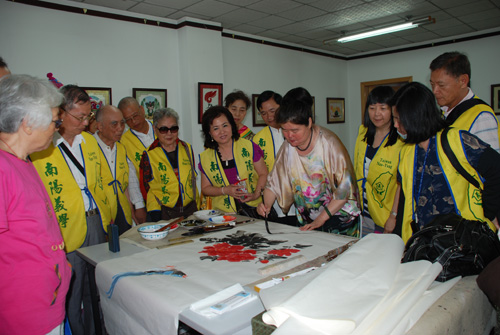 随后,在友好欢悦的气氛中,围绕老年健康和如何养老问题,双方进行了交流,互赠了纪念品;老年大学声乐班为来访者表演了小合唱《台湾岛》;舞蹈班表演了热情洋溢的民族舞蹈;绘画教师梁燕生现场作画,赠送林献忠团长,最后双方合影留念。