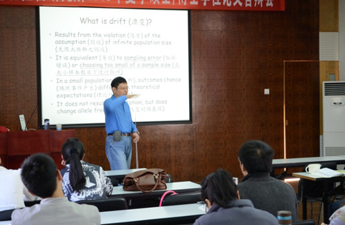 20日下午,由江友中教授讲授了保护遗传学中常涉及到的群体遗传学有关的概念、法则、模型以及方法,并结合一些人类的遗传疾病和一些群体遗传研究的实例深入浅出地讲解了在群体遗传中建立的模型及其相关的影响因素。授课的最后阶段,江友中教授以台湾特有的台东苏铁(Cycas taitungensis)的保护生物学研究和实践为例,讲授了保护遗传学研究的方法和数据分析方法,以及针对特定类群所应采取的研究策略。