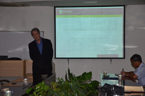 访问期间,Tony O’Donnell教授围绕当前土壤微生物功能基因组学、微生物生态学、土壤微生物地理学、基因组学等前沿问题,作了题为Analyzing microbial communities in soils: cheaper, faster, easier approaches to high throughput sequencing and metagenomics、microbial mapping at regional and national scales、Molecular indicators of soil quality等系列学术报告。他结合自己的研究案例,阐述了以土壤微生物群落的遗传信息为研究对象,采用先进的分子生物学手段,构建土壤微生物环境基因组学库;研究陆地系统内源有机质转化途径及其关键生物群落与功能;影响有机质积累、转化的环境因素与调控机制;土壤有机质提高对高生产力条件下生态系统稳定性的影响机制;土壤养分转化的生物学过程及其机制;不同生态区域土壤肥力的演变规律与主要驱动因子及机制;不同尺度土壤肥力及可持续性评价的方法与指标体系;同时探讨了食物网水平土壤生物相互作用及其生态功能。