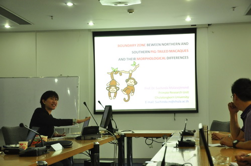 Suchinda教授生动地介绍了针对泰国的豚尾猴(Pig-tailed macaques)所作的一些工作。豚尾猴在泰国的南部型和北部型的地理分界以及分类地位一直饱受争议。通过对整个泰国范围广泛的访问调查和实地考察,Suchinda教授和她的团队确定了南北型的地理分界并且从外型上明确了南北型的差异,认为南北差异已经达到了物种的水平。