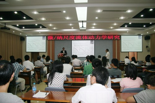报告会从三方面展开,Jason Reese教授介绍了学校和院系的概况,然后通过实例展示,重点就分子和多尺度工程流动面临的技术难题和解决方法作了系统介绍;Mónica Oliveira博士则介绍了利用微射流研究非牛顿流体的非线性流变学特性的进展,及这一应用的微设备优化情况;Yonghao Zhang博士重点介绍了利用lattice Boltzmann模型研究微通道射流的液滴动力学行为,结果显示表面活性对液滴行为有重要影响,利用激光诱导产生的马兰哥尼效应可以控制液滴的运动,参会人员就相关问题进行了积极的讨论交流。