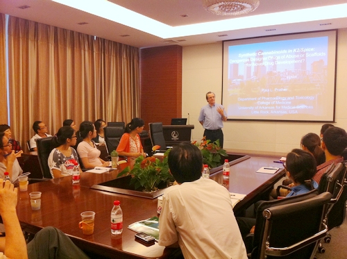 9月5日,应中科院上海药物研究所刘景根研究员的邀请,美国阿肯色州立大学(University of Arkansas)药理系Paul L Prather教授来药物所学术交流,并作了题为Synthetic Cannabinoids in K2/Spice: Dangerous Designer Drugs of Abuse or Scaffolds for Novel Drug Development?的学术报告。