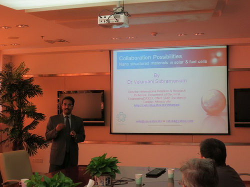 Velumanis教授是国际知名的能源材料科学家,自2007年以来,先后发表过60多篇学术论文,作了超过16次的邀请报告,并参与出版两部专业书籍。Velumanis教授的报告详细介绍了CINVESTAV研究所的研究领域、研究实力及实验室的主要研究设备,并展示了研究所目前的研究方向及取得的部分成果;同时Velumanis教授对目前新能源领域的发展趋势做了全面的评述。
