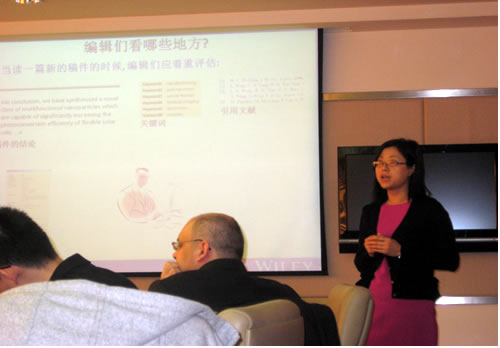 PeterGregory教授介绍了Wiley材料科学期刊论文发表的报告;Wiley出版社中国分社的胡晓歌编辑就如何提高投稿成功率详细介绍了投稿过程中需要注意的一些细节,包括如何撰写投稿信、怎样组织论文的摘要和结论部分、如何适当引用参考文献及怎样选择审稿人等都作了详细的介绍,她与大家分享了作为编辑审查文章的体会。报告吸引了硅酸盐研究所众多研究人员及研究生的参加,他们就各自感兴趣的问题与Gregory教授和胡晓歌编辑进行了热烈的交流与讨论,受益匪浅。