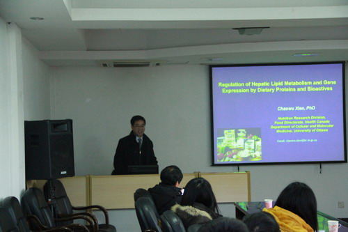 2月20日,加拿大卫生部食品署营养局分子营养室研究员、渥太华大学细胞分子医学系联合教授肖朝武访问中科院亚热带农业生态研究所,并为该所师生作了题为“蛋白质与生物活性物质对机体脂质代谢及基因表达影响”的学术报告。亚热带生态所副所长谭支良主持报告会。