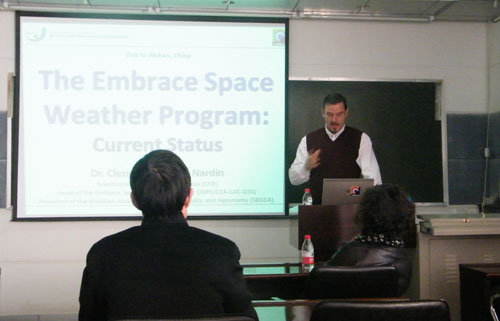 Clezio Marcos De Nardin教授分别作了题为The EMBRACE space weather program: current status和A Magnetometer Network in South America: the Station K index两个报告。